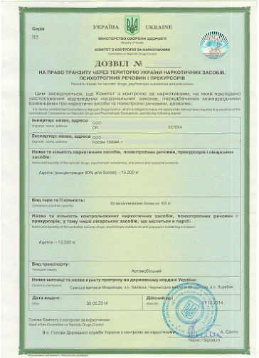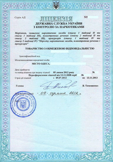 Лицензия на оборот психотропных веществ, наркотиков и прекурсоров выдается Государственной службой Украины по контролю над наркотиками. Срок действия разрешения — 5 лет.