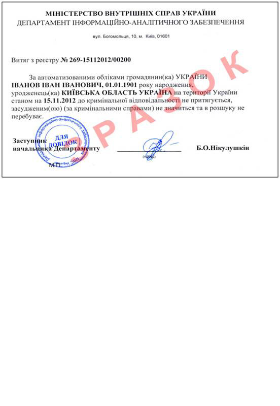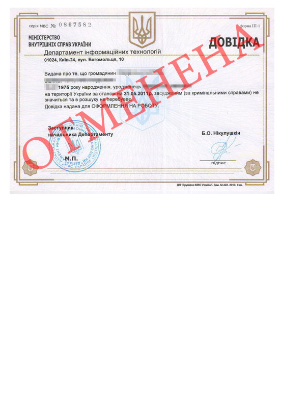- Для предъявления на территории Украины. Бланк, на котором печатается справка о несудимости, не имеет защитной голограммы. Заказать справку о несудимости могут как граждане Украины, так и иностранцы. Срок действия документа данного вида – 90 дней.