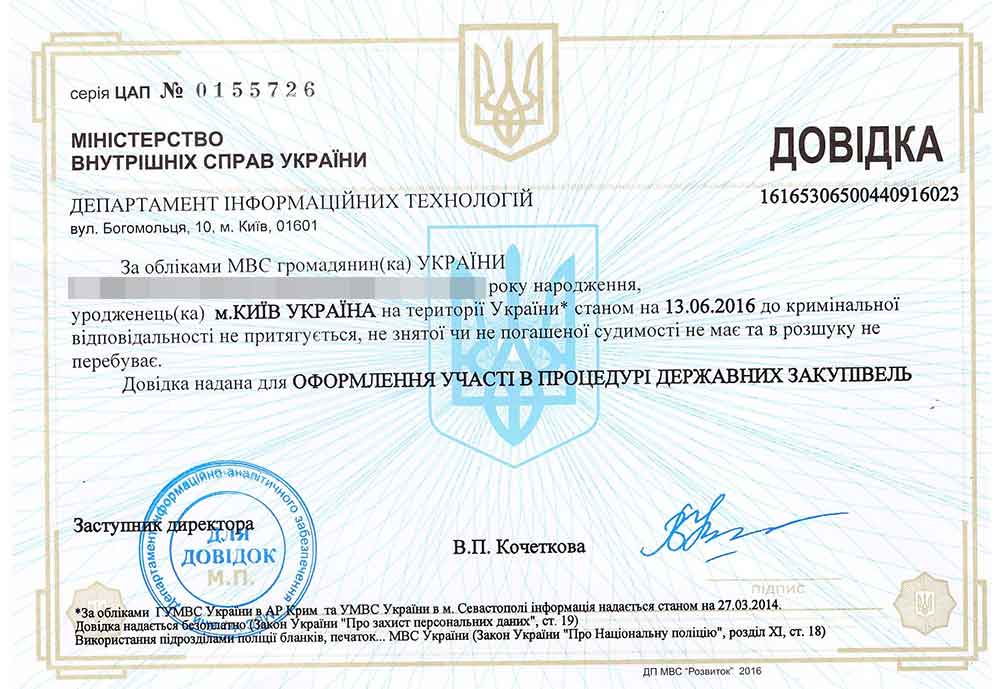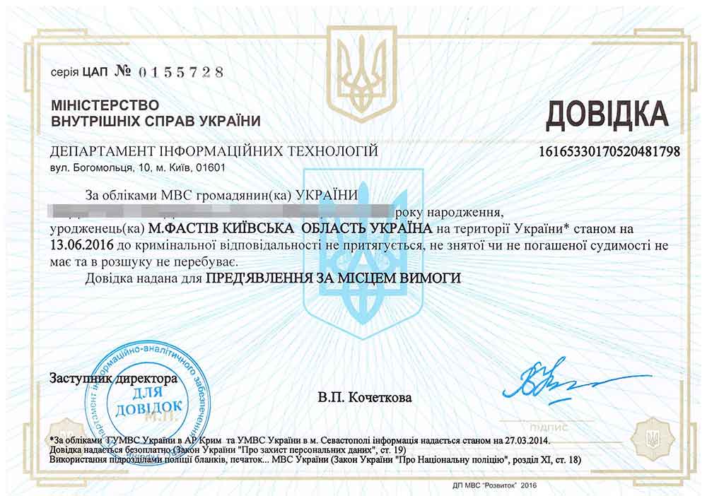 Также справки для внутреннего использования на территории Украины часто требуют многие государственные органы, например, для получения земельного участка или при участии в тендере. Обязательной такая справка будет для получения лицензии на работу с наркотическими, психотропными веществами, прекурсорами, при оформлении на работу с взрывоопасными веществами.