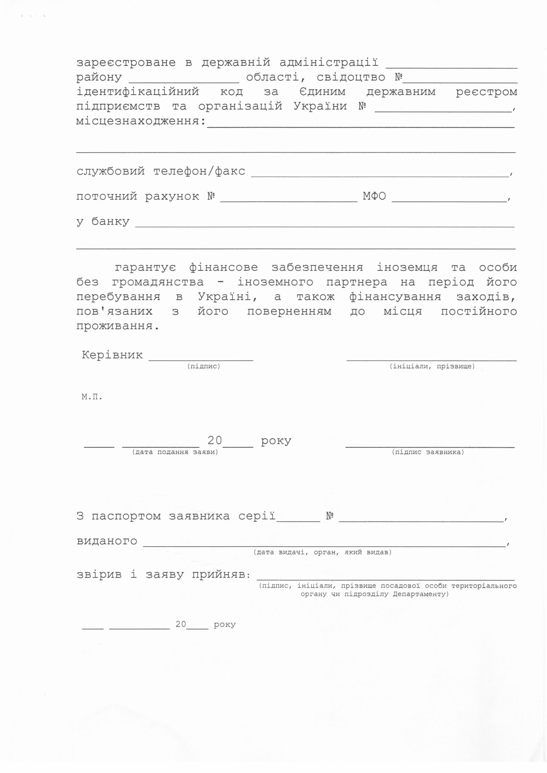 Cudzoziemiec wraz z przyjmującą stroną składa wniosek o przedłużenie rejestracji cudzoziemca na Ukrainie w służbie migracyjnej według miejsca zamieszkania. Od cudzoziemca wymagane jest dostarczenie następujących dokumentów: