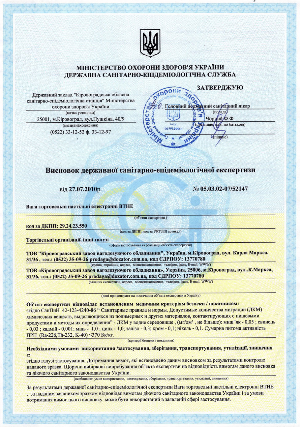 - Висновок санітарно-епідеміологічної експертизи на продукцію;