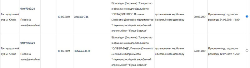 Замовником будівництва є ГП Агрокомбинат “Пуща-Водица” і если мы откроем извлечение из реестра по этому госпредприятию, то в конце увидим огромный список судебных документов. Да, далеко не из них актуальны. Но если копнуть глубже, то можно увидеть, что последние несколько лет уголовные дела вокруг земель Пущи-Водицы растут как грибы. С завидной регулярностью в различных уголовных делах пытаются доказать, что земли, которые были в пользовании Пущи-Водицы незаконно выведены из состава государственной собственности.