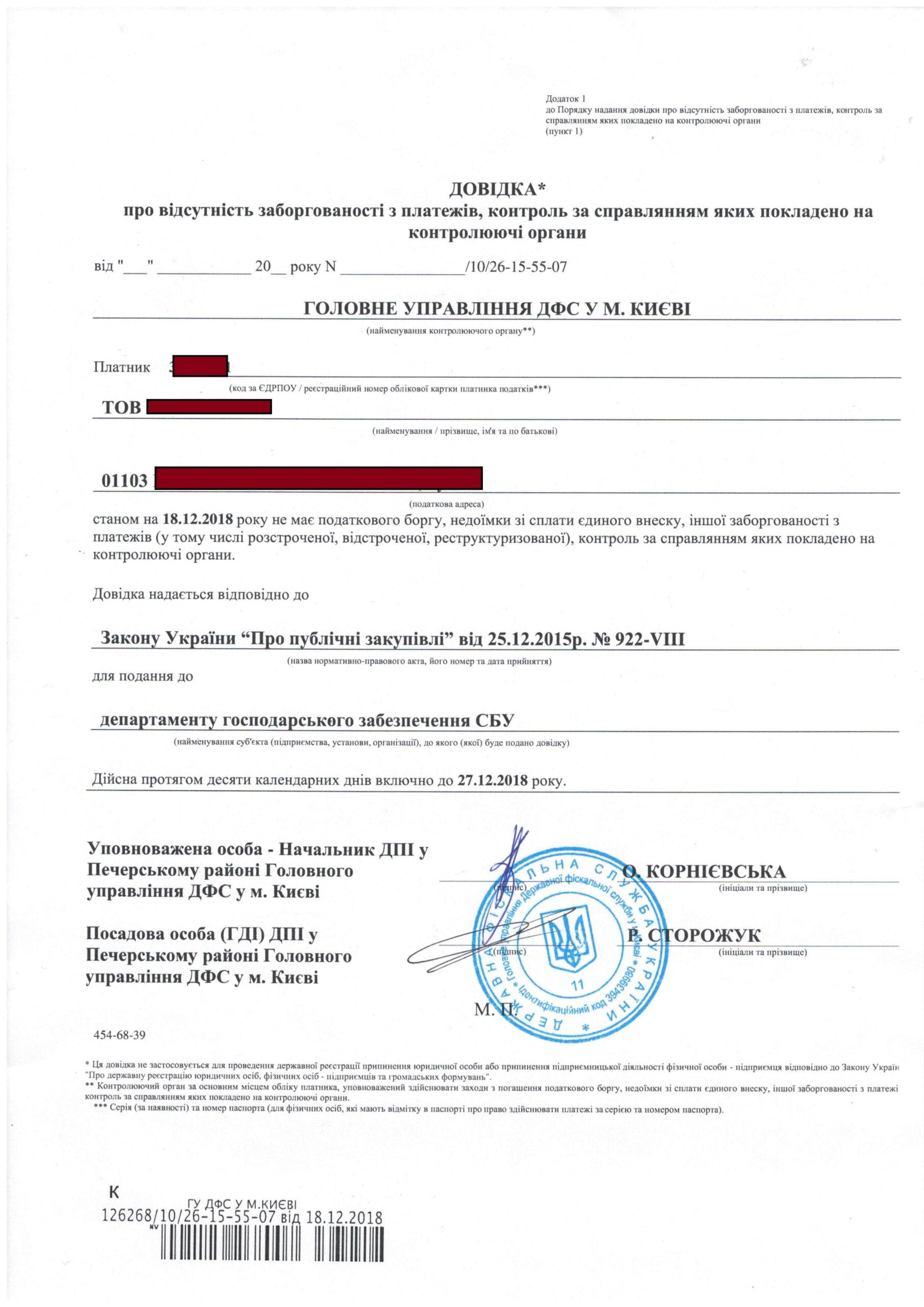 Довідка про відсутність заборгованості перед бюджетом6 робочих днів900